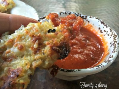 Today’s recipe~cheesy cauliflower breadsticks~was another hit with the kids. We dipped these in our favorite pizza sauce (Del Grosso) and felt like we’d really splurged! I served these with spaghetti squash (another new obsession that I’ll blog about soon), and we were totally riding the yummy train!:-)