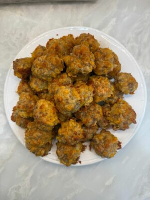 My husband is addicted to these sausage cheese balls! We love them Dipped in grape jelly or pancake SYRUP!