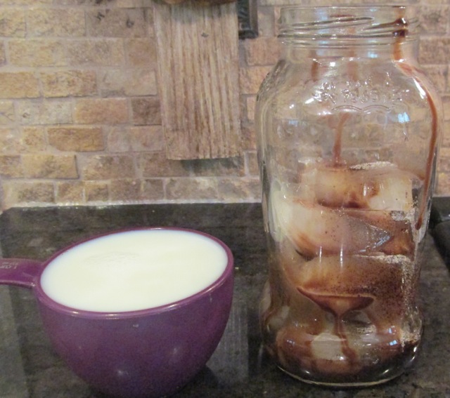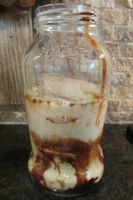 Shaking the drink is what gives it the smooth consistency and frothy top. I use 16-ounce Bell jars and shake the frappe with half of the milk before adding the rest and shaking again. This is a whopping portion of caffeine AND calories, so I drink these sparingly or share with one of the girls. The recipe is below.