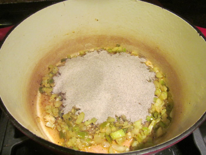 - Sauté onion, pepper, and celery for 5-6 minutes or until soft, adding garlic toward the end.