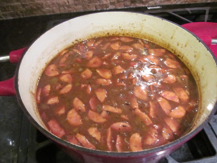 - Add sausage to gumbo; simmer on low heat.