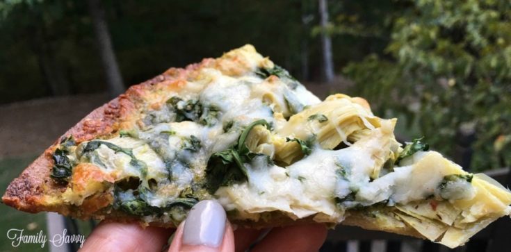 This spinach artichoke pizza is one of our favorites, and it is so quick and easy (less than 30 minutes), I make it often. Everything needed for the pizza is store bought.