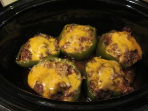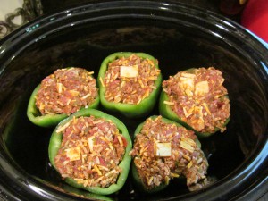 Note: I have this 6-quart slow cooker and could only fit five peppers into it. I’ve recently discovered small-medium colored peppers that come in a package and are located in the refrigerated produce case (near cucumbers, carrots, etc….). I think these smaller peppers would be the perfect size and much easier to fit into most slow cookers.