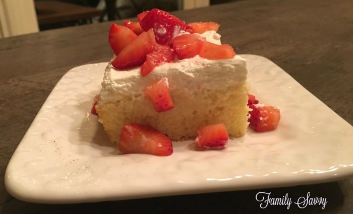 This moist tres leches cake with strawberries is a cake mix dessert that tastes divine and will feed up to 15 guests!